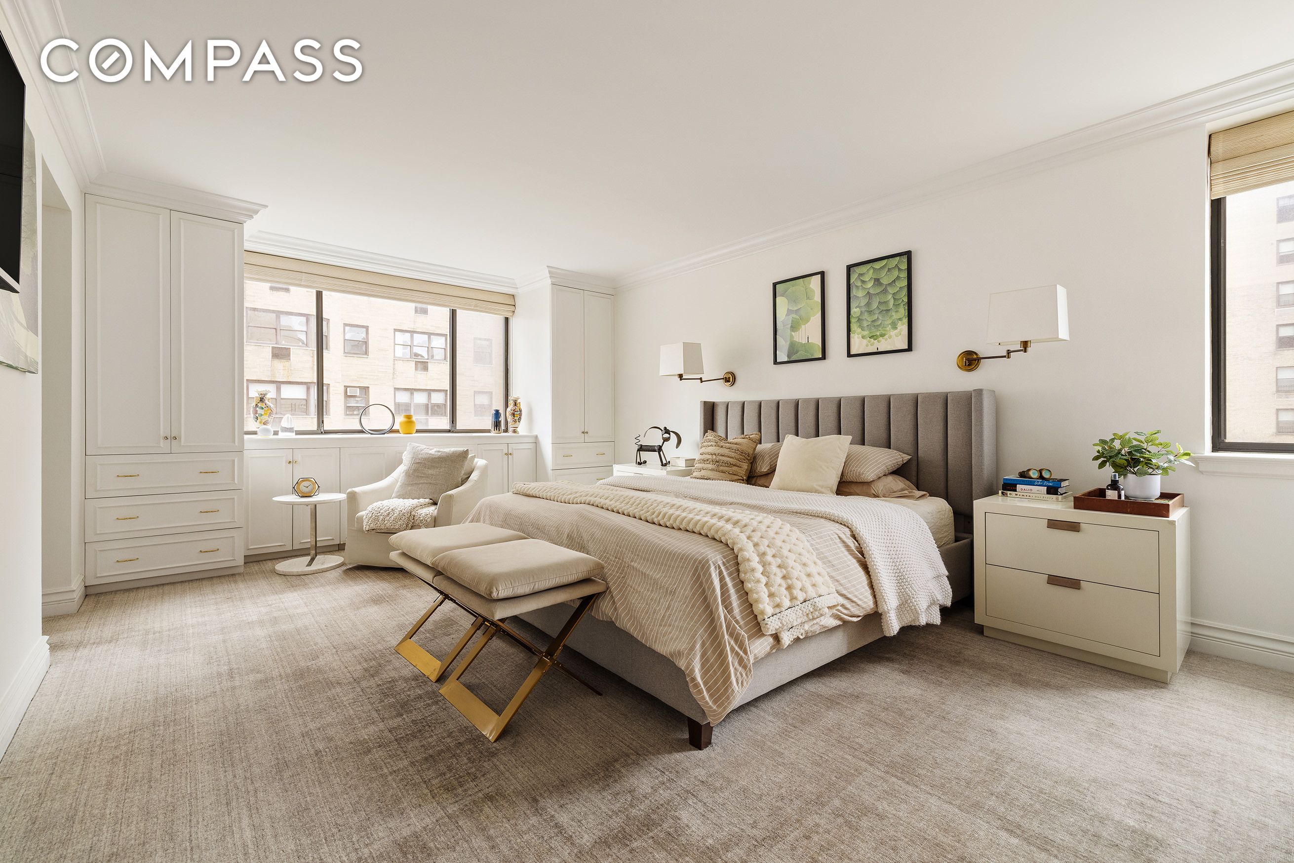 A huge primary bedroom is graced with sunlight from south and west exposures, has two walk-in closets, and an en-suite windowed bath with deep soaking tub and separate glass shower. The spacious 2nd bedroom enjoys sunny southern exposure, and an adjacent opulent 2nd bath.