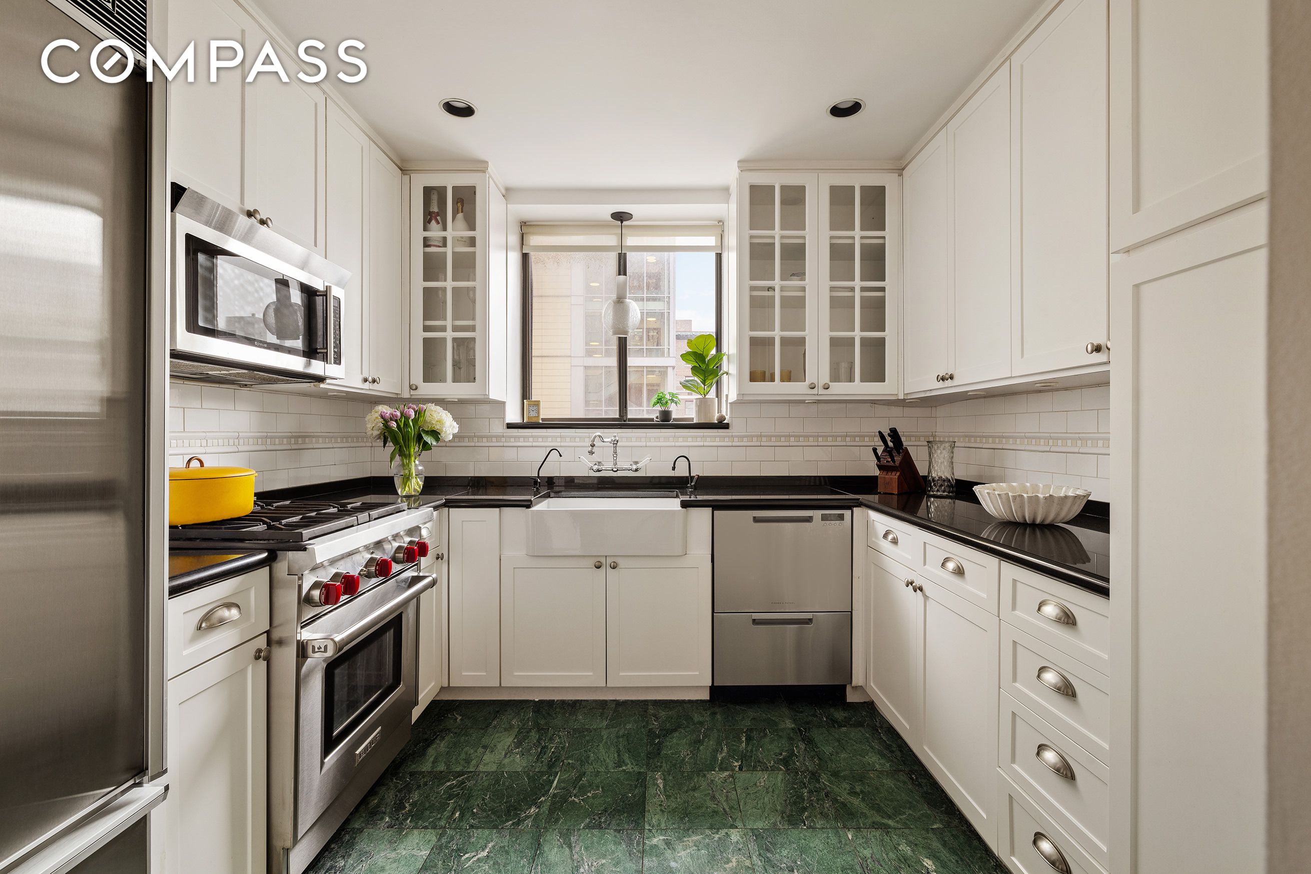 The windowed chef's kitchen provides extensive granite counters, Sub Zero refrigerator with bottom freezer and ice-maker, Wolf range, Fisher & Paykel 2 drawer dishwasher, and excessive storage.